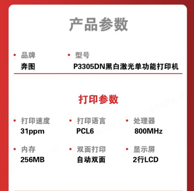 參數(shù) [品牌] 奔圖 [型號] P3305dn [毛重] 6.8KG